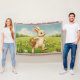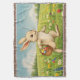 Celebrate Easter holiday with this charming super adorable Greeting Card featuring a joyful white bunny hops through a sun-drenched meadow bursting with wildflowers — daisies, tulips, bluebells, and dandelions — while carrying a woven basket filled with colorful, patterned Easter eggs.