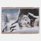 Un loup dans la neige de l'hiver avec un château derrière le loup.