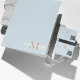 Cadeaux modernes, élégants et tendance présentés ici en bleu poussiéreux avec monogramme bronzé et typographie de nom blanc. Les couleurs peuvent être customisées à votre choix
