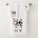 Bath towel set, consisting of a face cloth, hand towel and bath towel with an cow design. You can customise this bath towel set with any text of your choice. Should you require any help with customising then contact us through the message link on this page. Cow design bathroom towel set