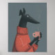 Bring warmth and whimsy to your walls with this stylized illustration of a black greyhound enjoying a hot drink. Dressed in a ribbed red-orange sweater and holding a striped pink mug, this anthropomorphic dog radiates cozy charm and artistic flair. The muted blue-gray background adds a modern touch, making it perfect for pet lovers, quirky art collectors, or anyone seeking unique wall decor. Ideal for living rooms, offices, or cafés, this poster is a standout gift for dog enthusiasts.