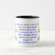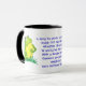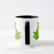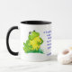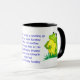 Une tasse blanche avec une jante et une poignée noires et une grenouille verte avant et arrière, d'une illustration de l'aquarelle de Judy Adamson. Entre les deux grenouilles se trouve le premier verset de la rime de la pépinière, 'Une grenouille qu'il allait a-boiser..' en lettres bleues.