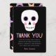Cette carte de remerciement mignonne présente un crâne dessiné à la main, avec des accents pastel rose et violet. Le texte moderne lit "MERCI" en violet pastel, pêche et rose. Les modèles de texte sont inclus pour une personnalisation facile. Parfait pour envoyer après une fête d'anniversaire sur le thème d'Halloween ou d'horreur !