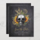 Faites savoir à vos invités que vous avez fixé une date pour votre mariage avec cette carte "save the date" représentant une tête de mort gothique et des fleurs.