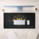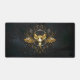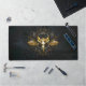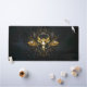 Dessin artistique, symétrique, composition noire et or, ailes d'oiseaux, doré, crâne d'oiseau décoré de motif doré sur arrière - plan sombre, texturé.Style gothique