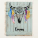 Vieille clôture patinée bleue et rustique ornée d'une illustration d'un crâne de boeuf rustique orné de brins de plumes et de perles qui sont faits d'aquarelles. Personnalisez-le avec votre nom en utilisant le bouton "Personnalisez ce modèle". Grand planificateur pour l'école, le bureau ou la maison!