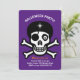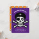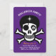 Invitation de fête avec crânes effrayants d'Halloween sur fond orange et violet. Tous les textes et numéros sont prêts à être personnalisés.