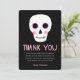 Cette carte de remerciement mignonne présente un crâne dessiné à la main, avec des accents pastel rose et violet. Le texte moderne indique "MERCI" en violet pastel, pêche et rose. Des modèles de texte sont inclus pour une personnalisation facile. Parfait pour envoyer après une fête d'anniversaire sur le thème d'Halloween ou d'horreur !