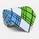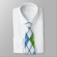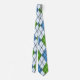 Cette cravate a un design art déco de formes en losange fait d'angles superposés en lignes noires colorées dans les tons bleu et vert avec des lignes noires en diagonale donnant l'apparence d'un Jacquard