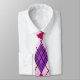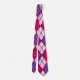 This tie has an art deco design of diamond shapes made from overlapping angles in shades of purple and pink with diagonal black lines making the design look like argyle