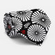 This minimalist, bold pattern looks like a hypnotizing or moving floral and sun design. It uses simple black and white rays (like a sunburst) and features small red leaves for a nice pop of color. This is a great retro look with a 60s style feel, perfect if you want a chic and modern statement piece.