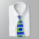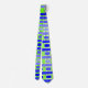 Cette cravate a un design géométrique de lignes dans les tons bleu et vert tissé pour faire un plaid.