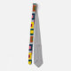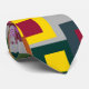 Cette cravate a un design géométrique de carrés à l'intérieur des carrés en brun, noir, brique, jaune, turquoise, vert, violet, jaune, or, rose, rouge, gris sur un champ de gris plus clair.