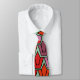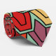 Cette cravate a un design art déco de tulipes de pentagones et trapézoïdes en orange, rouge, violet, or et vert.