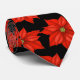Cette cravate masculine est montrée en noir avec un imprimé de poinsettias rouge de Noël festif.