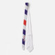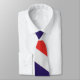Cette cravate est décorée de rayures en diagonale rouge, blanc et bleu, et d'un pôle coiffeur.
