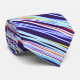 Cette cravate comporte un motif de fractale d'intersecter les rayures diagonales. Les couleurs incluent le bleu marine, le rouge, le blanc, le jaune, l'aqua et bleu-clair. La conception est imprimée des deux côtés.