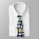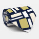 Stylish necktie featuring a refined geometric pattern of rectangular shapes arranged in alternating horizontal and vertical directions. The ornament-like design combines ivory, gold, soft turquoise, and white tones, set against a deep dark navy blue background for a rich and elegant contrast.