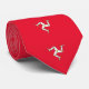 Drapeau de l'île de Man. Le drapeau de l'île de Man, ou le drapeau de Mann (Manx : brattagh Vannin), est un triskelion, composé de trois jambes blindées aux éperons dorées, sur un arrière - plan rouge. Il est le drapeau officiel de Mann depuis 1931 et est basé sur les armoiries de Manx, qui datent du XIIIe siècle. Les trois pattes sont connues à Manx comme n'importe quel cassin d'arbre ("les trois pattes"). Le triskelion est un symbole ancien, utilisé par les Mycéniens et les Lycians. On ignore pourquoi le symbole a été adopté à l'origine sur l'île de Man. Avant son adoption en 1931, le drapeau officiel de l'île de Man était le drapeau de l'Union.