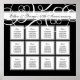 Elégant tableau noir et blanc pour une fête de 85 à 120 personnes. Convient aux anniversaires, mariages, anniversaires et autres événements spéciaux. Nous serons heureux de vous aider à customiser ce tableau pour le nombre d'invités et de tables à votre mariage ou à votre fête officielle. Les couleurs arrière - plans et les couleurs de texte sont toutes personnalisables.