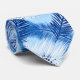 Cravate dans une empreinte tropicale de silhouettes de feuilles de palmier se chevauchant, dans les tons bleu cobalt, marine / indigo, et blanc, contre un arrière - plan bleu ciel clair