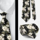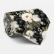 Une cravate à motif floral aquarelle noir et blanc présente un design élégant et sophistiqué avec des fleurs de formes et de tailles variées, contrastant sur un fond noir ou blanc. Les motifs floraux sont complexes, avec des pétales, des feuilles et des tiges rendus avec des lignes nettes et des ombrages. Le design varie des fleurs audacieuses et grandes aux fleurs délicates et plus petites, créant un look équilibré et dynamique.