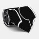 Cette cravate a un design art déco de demi-cercles blancs se connectent avec des lignes sur un champ de noir.