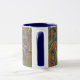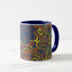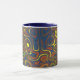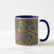 Un cool Ringer Coffee Mug, avec une jante et une poignée bleu foncé et un motif abstrait de tourbillons fou dans les tons foncé, bleu, vert foncé et marron avec des tons jaunes dorés.