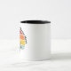A customizable ceramic mug with a sunset and steaming coffee graphic, showing an example where personalized text can be added by the buyer.