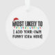 Vous cherchez un vêtement de Noël amusant, original et personnalisé? Notre texte modèle "Le plus susceptible de" est exactement ce dont vous avez besoin! Vous pouvez transférer le design à des t-shirts tendance à des tasses de voyage et des autocollants, cette collection est parfaite pour montrer votre ambiance unique. Des tonnes d'idées sont incluses ici pour faire couler vos jus créatifs. Idées cadeaux parfaites pour les amis, la famille, patron, collègue, collègue, enseignant, enfants, adultes, mamans, papas et plus ! Que vous soyez "le plus susceptible d’être en retard à la classe", "le plus susceptible d’être trouvé à Brunch" ou même "le plus susceptible de prendre une sieste n’importe où", nous avons l’article parfait pour vous. Avec des conceptions populaires comme "Most Likely to Win at Trivia", "Most Likely to Bring Snacks" et "Most Likely to Go Viral", cette collection est tout sur la célébration des moments amusants et relatifs qui vous font, eh bien... vous! Préparez-vous à représenter votre personnalité avec style - peu importe où vous allez! thèmes plus amusants "Les plus probables" : "Les plus susceptibles de commencer une fête de danse", "Les plus susceptibles de commander un décollage", "Les plus susceptibles d'être la vie du parti", "Les plus susceptibles de regarder une série", "Les plus susceptibles de prendre un selfie", "Les plus susceptibles d'oublier leurs clés", Probable de se briser en chansons, "très susceptible de porter des pyjamas toute la journée", "très susceptible d'aller sur une route spontanée," "très susceptible de raconter une blague à papa", "très susceptible de citer des films," "très susceptible d'être fashionablement en retard", "très susceptible de posséder trop de Plantes", "très susceptible de boire tous Le café, "Les plus susceptibles de dormir à l'alarme", "les plus susceptibles de se procrastiner", "les plus susceptibles de suremballer", "les plus susceptibles de gagner un argument", "les plus susceptibles de vous faire rire", "les plus susceptibles de jouer à chaque chien", "les plus susceptibles de rester trop tard", "les plus susceptibles d'accueillir la nuit du jeu", Il est probable qu'il soit un parfait."