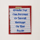 Faites-la vous-même avec cet amusement, modèle fait sur commande de puzzle. Écrivez facilement votre propre texte, photo mignonne, conception de résumé, motif, une citation drôle, ou même une insulte sur la note de papier attachée du ruban adhésif. Cliquez sur juste dessus la "personnaliser il" et puis ajoutez votre propre message personnel et ou photographiez. Quand ils remontent finalement le puzzle entier ils recevront votre message ! Grande idée pour le jour de Valentines, ou "vous m'épouserez ?" Les grands cadeaux personnels pour la famille, comme la maman ou le papa, professeur, et amis, amie, ami, etc. montrés sont des couleurs de texte rouge d'arrière - plan et de bleu ce qui peut facilement être changé en toutes les couleurs davantage à de personnaliser. Queest-ce que votre message va être ?