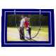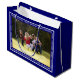 Photos de Noël et des bordures bleues, blanches avec les souhaits grand sac cadeau. Photographie © Storytree Studios, Stanford, CA