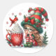 Créez votre propre étiquette de cupcake avec votre propre police, texte et couleur arrière - plan !Une scène de Noël fantaisiste mettant en vedette un petit elfe aux grands yeux expressifs et aux cheveux bouclés dorés. L'elfe porte un chapeau festif vert et rouge à rayures orné de feuilles de houx, de baies et d'un grand nœud rouge. Elle est vêtue de bas assortis rouges et blancs à rayures et de chaussures vertes avec des boucles dorées. À côté de l'elfe se trouve une grande tasse rouge remplie de chocolat chaud surmonté de crème fouettée et de paillettes colorées. Un petit oiseau rouge est perché sur la crème fouettée, ajoutant une touche de charme à la scène. Des flocons de neige tombent doucement autour d'eux, créant une atmosphère hivernale magique. Des branches de pin et des baies rouges décorent l'arrière-plan, renforçant l'esprit des fêtes.