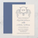 le design montre une faire-part de mariage en calligraphie et typographie bleu poussiéreux classique avec une crête florale en haut avec un monogramme de nom de couple à l'intérieur. le design est extrêmement unique et classique et sera le meilleur pour votre mariage.