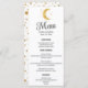 Voici l'élégant et intemporel Crescent Moon Starry Night mariage menu. Parfait pour toute réception de mariage d'inspiration céleste, ce menu impressionne vos invités par son design époustouflant. La papeterie blanche est ornée d'une lune au croissant d'or brillant et d'une collection d'étoiles d'or, lui donnant un look classique et sophistiqué. Le menu du jour présente les noms du couple et la date du mariage, ainsi qu'une délicieuse sélection d'entrées, de plats et de desserts. Les éléments du menu sont écrits dans une simple police de bloc noir qui est facile à lire, tandis que le mot MENU est écrit dans une police de script inclinée élégante qui ajoute une touche d'élégance. Au fond du menu, vous trouverez un bel arrière - plan d'étoiles blanc et or qui complète parfaitement le design avant. Que vous choisissiez d'afficher le menu sur chaque table ou de le distribuer à l'arrivée des clients, le menu mariage du Crescent Moon Starry Night est un joli complément à toute réception. Fabriqué avec des matériaux de haute qualité, ce menu est conçu pour être dernier et peut être facilement customisé pour s'adapter à votre thème mariage unique. Alors pourquoi se contenter d'un menu simple et ennuyeux quand vous pouvez impressionner vos invités avec le menu Crescent Moon Starry Night mariage?