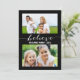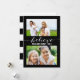 Vos salutations de vacances à vos amis et votre famille seront uniques en utilisant ce design carte photo de vacances élégant et simple avec le mot "Croire" écrit dans une police de caractères populaire, en caractères blancs sur un arrière - plan noir avec des porte-places pour deux photos de famille dans une mise en page verticale de carte. Design par ELKE CLARKE© POUR MONOGRAM GALLERY. Remplacez les exemples de photos par les vôtres. Le motif rayé noir et blanc au dos de la carte peut être modifié ou supprimé. Autres couleurs disponibles en magasin ou en contact designer.