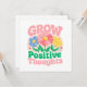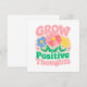Faites naître un état d'esprit plus éclatant avec cette carte de voeux "Grow Positive Thoughts", qui présente des fleurs fantaisistes et colorées et des lettres motivantes. Cette oeuvre joyeuse encourage la pleine conscience, l'amour de soi et la croissance personnelle, en faisant un cadeau parfait ou un rappel personnel pour rester positif et diffuser de bonnes vibrations. Ce design d'inspiration florale apporte beauté et encouragement à la vie quotidienne.