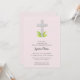 Croix blanche perle sur fond de feuilles vertes sur un fond rose pâle avec texte gris doux, design parfait pour la Première Communion, le Baptême, le Baptême ou toute occasion spéciale religieuse. ARTICLES CORRESPONDANTS dans notre magasin.