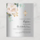 Un arrière - plan faux argenté. Fleur blanche, fleurs, végétation eucalyptus et croix dorée. Personnalisez et ajoutez un nom et des détails. 1 feuille = 1 invite imprimé bord à bord.