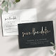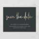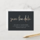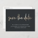 Une carte postale moderne de faire-part avec "save the date" en lettrage manuscrit à la feuille d'or sur un fond noir riche et doux. Personnalisez avec vos noms, date et lieu de mariage ci-dessous en lettrage blanc.