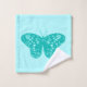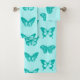 Serviette sertie dans des croquis numériques de papillons assortis adaptés à partir d'illustrations vintages, et numériquement couleur - turquoise /paon sur un arrière - plan aqua clair