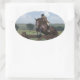 Cet autocollant ovale présente une oeuvre d'art numérique originale d'un cheval et d'un cheval sautant au-dessus d'une ferme, créée en Vue par l'artiste Jayne Wilson.