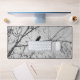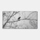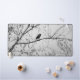 Photo en noir et blanc d'un oiseau noir perché sur une branche d'un arbre. Les branches d'arbres ont des graines pendantes d'eux. Les branches et les gousses de graines créent un arrière - plan abstrait autour du petit animal noir. Copyright photo ©Kimberly J Tilley.