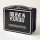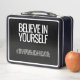 Boîte à lunch en métal de qualité supérieure avec un design noir et blanc audacieux qui dit "Croyez en vous" et une citation motivante : "Un oiseau assis sur un arbre n'a jamais peur de casser la branche, parce que sa confiance n'est pas dans la branche mais dans ses propres ailes." Durable et pratique, cette boîte à lunch est parfaite pour l'école, le travail, ou comme un coup de pouce quotidien de confiance. Idéal pour quiconque veut porter encouragement et positivité où qu'il aille.