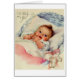 Une image de carte de félicitations de bébé de cru comporte un bébé doux et souriant dans un berceau en osier avec un agneau bourré le long. L'avant de la carte indique, "au bébé et à vous" et au message à l'intérieur de la carte est, "souhaitant vous un avenir rempli avec amour, au bonheur, et au rire avec votre nouveau bébé."