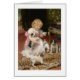 Une petite fille adorable se met à genoux sur le plancher avec sa tasse de thé pendant qu'elle offre une soucoupe de thé à ses quatre chiots espiègles. L'illustration est par Arthur John Elsley (1860-1952) qui étaient célèbres pour ses peintures des enfants et de leurs animaux familiers. La carte est intérieur vide pour votre propre message.