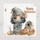 Crypt Cutie - Autumn Leaves & Mummy Mischief Une momie aux yeux larges enveloppée dans des bandages en lambeaux se dresse à côté d'une petite crypte, entourée de trois citrouilles expressifs, l'un souriant, l'autre surpris et l'autre non sculpté. Une branche sans feuilles s'étend au-dessus, tandis que des feuilles d'automne éparpillées et des pierres marquées de runes ajoutent texture et mystère. La palette feutrée de gris, d'oranges et de marron allie charme éffrayant et chaleur saisonnière, captant la fantaisie d'Halloween avec une touche de pierre tombale.