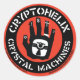Design noir et blanc sur rouge arrière - plan de main avec plusieurs icônes, la phrase "Crystal Machines" se référant à une chanson du groupe Cryptohelix.