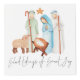 Illustration de la crèche Paroles de Carol Noël. Illustrations modernes de chaque côté de Marie, Joseph et Jésus-Bébé dans sa crèche et avec son berger et son mouton et les trois rois, et un ange avec une ligne de différentes chants de Noël dans un stylet script sur chacun.