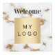Pour les chambres d'hôtel, tables de restaurant, propriétés de location. Personnalisez et ajoutez le logo de votre entreprise, ainsi que de l'espace pour 4 codes QR. Impression en marbre blanc et doré comme arrière - plan, texte noir.